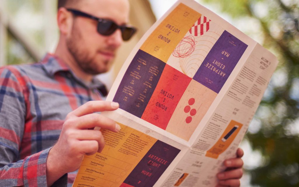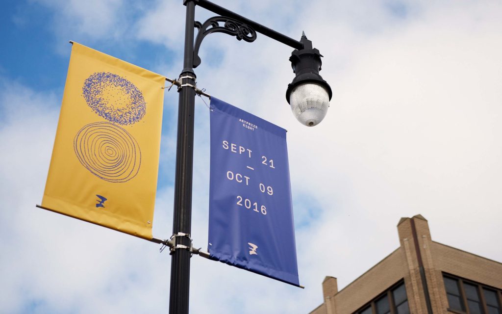 ArtPrize is an open art competition in Grand Rapids, MI. Developed by Conduit Studio, “the ArtPrize Eight identity contains a system of fifty-two patterns, two for each letter in the English alphabet. Viewers are encouraged to choose the pattern they identify with and pair it with what might be considered an opposite. This pairing creates a contrast (as well as a signature “8”) that represents the creative tension that exists within the fabric of the event — between art and viewer, artist and venue, public and juried vote.” Over the course of 18 days there were over 380,000 votes cast and more than 400,000 people visited ArtPrize Eight.